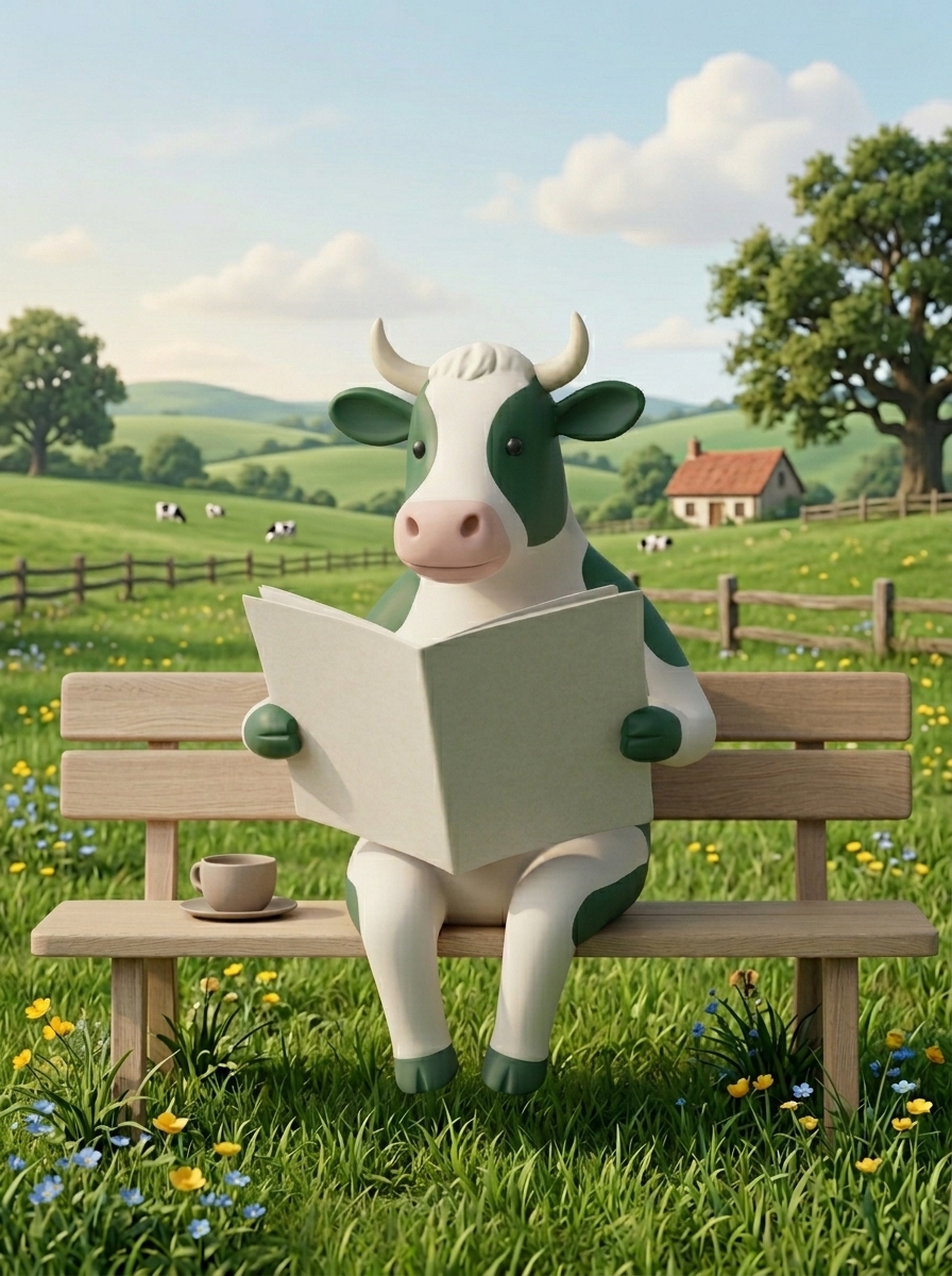 [ Bild: Eine entspannte Kuh auf der Weide, die beobachtet, wie andere im Hamsterrad rennen — Symbol für exklusive, entspannte Reichweite ]